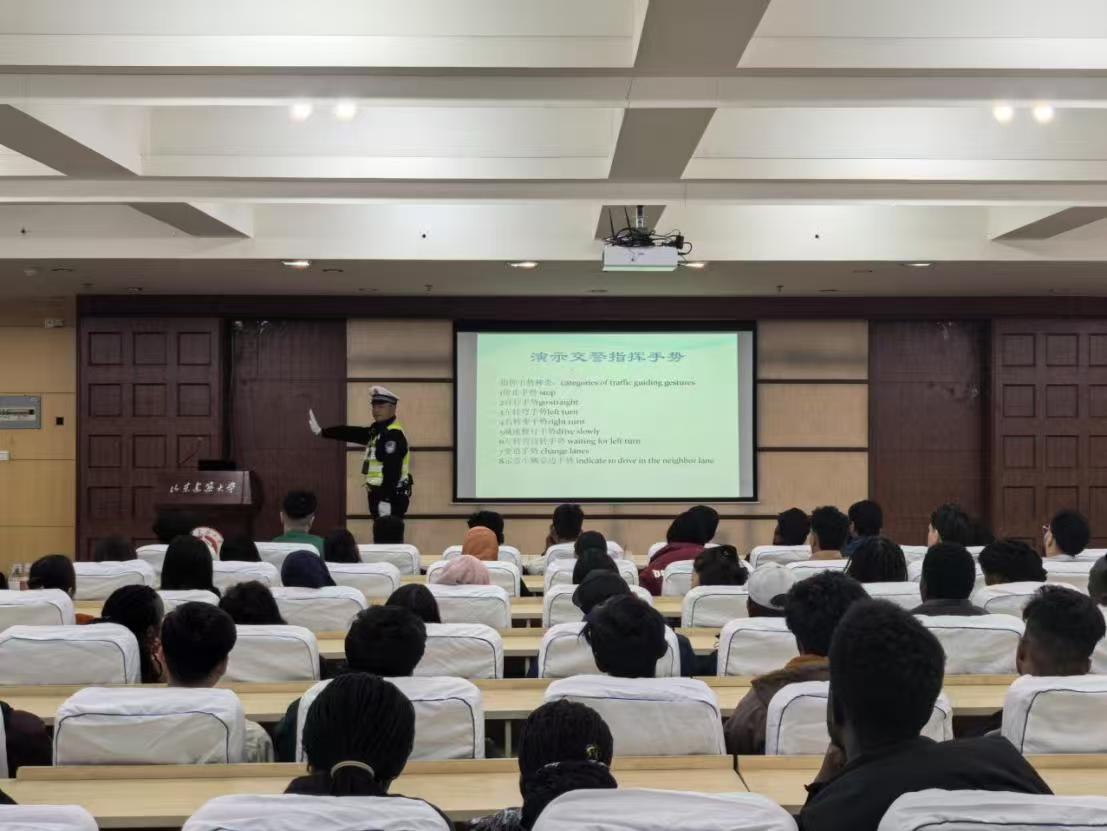 济南市公安局历下交通管理大队刘海洋警官以《道路交通安全法》为纲,全面解读国内交通规则、机动车驾驶许可申请条件及交警手势信号规范。借助真实事故案例的直观呈现,刘警官深刻阐释了交通违法的法律后果与社会责任,并通过现场互动问答与模拟指挥手势教学,强化了外籍师生对安全出行规则的理解与记忆。