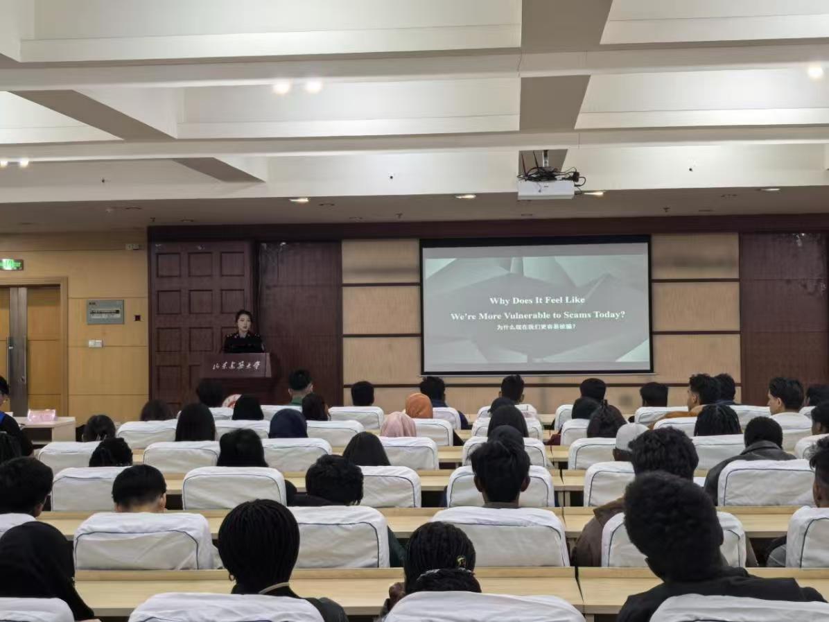 高新分局民警赵君颜聚焦“反诈防骗与安全守护”主题,深入剖析国际学生因语言文化差异、信息获取渠道有限等因素易成为诈骗目标的现实风险。通过典型案例复盘与风险点警示,赵警官详细传授了识别电信诈骗、网络陷阱的实用技巧,并强调了“不轻信、不转账、及时报警”的防骗铁律,为师生财产安全筑起防护屏障。