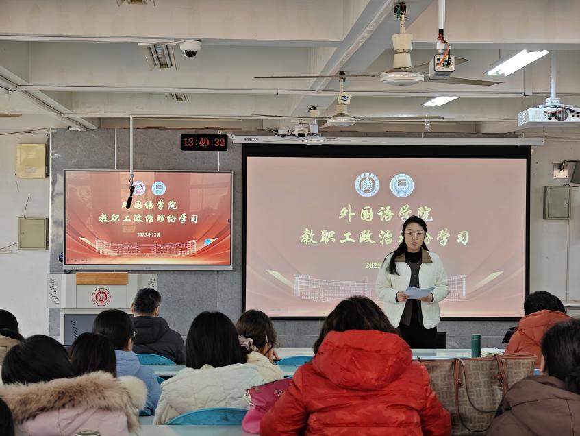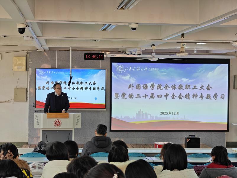 12月11日,外国语学院于外文楼211室召开教职工政治理论学习大会,并开展党的二十届四中全会精神专题宣讲。大会由学院党委副书记、院长钟京伟,党委副书记刘莹,组织员李艳华领学,学院全体教职工参加。