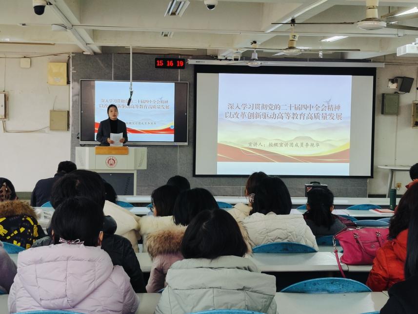随后,李艳华以《深入学习贯彻党的二十届四中全会精神 以改革创新驱动高等教育高质量发展》为题进行理论宣讲,阐述了全会基本情况和重大意义,指出各位教师应准确把握“十五五”战略部署,深刻认识高等教育肩负的新时代使命,着力进行高质量人才培养,全面提升科研创新能力,主动对接国家战略、服务发展大局。