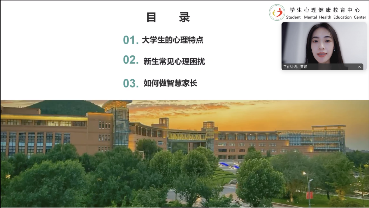 为深入贯彻落实高校心理健康教育工作要求,助力2025级新生平稳度过入学适应期,搭建家校协同育人桥梁。近日,外国语学院面向2025级新生家长专题举办新生家长心理课堂。本次课堂由新生辅导员乔婷主持,学校心理健康教育中心董颖老师担任主讲嘉宾,为家长系统解读新生心理适应规律与科学支持策略。