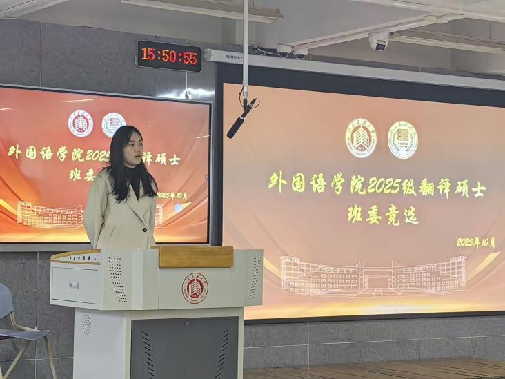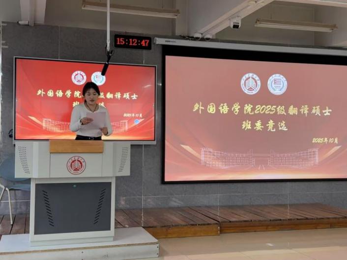 新班级期待新贡献,新责任呼唤新行动。10月21日,外国语学院于外文211组织2025级翻译硕士研究生班委竞选大会,旨在选出责任心高、服务意识强、综合能力突出的同学组成班委团队,增强班级凝聚力,为班级发展与同学成长保驾护航。学院学生工作办公室主任王冰、2025级翻译硕士研究生3位班导及研究生学生干部代表参加本次大会,竞选大会由学院新一届研究生会副主席秦冰琰主持。