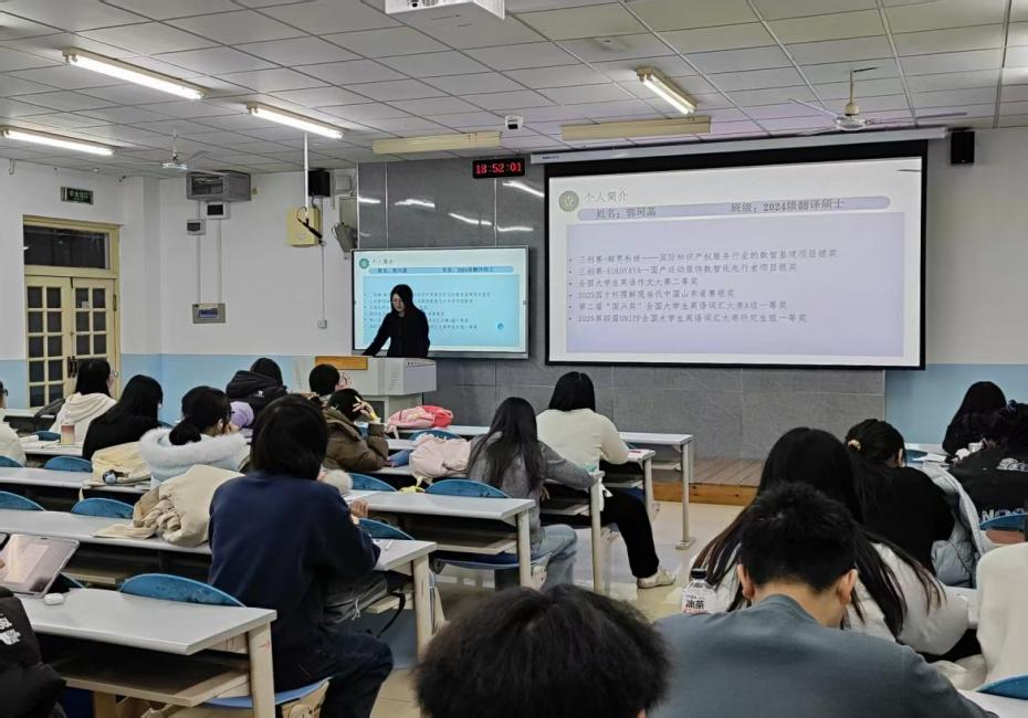 为助力学生积累科创竞赛经验、提升创新创业能力,推动学院“双创”教育深入专业领域,11月21日,学院于博文楼513教室举办“科创竞赛经验分享”主题讲座。本次活动由2024级翻译硕士、“双创”朋辈导师郭珂菡担任主讲,英语254、255、256班学生参与活动。