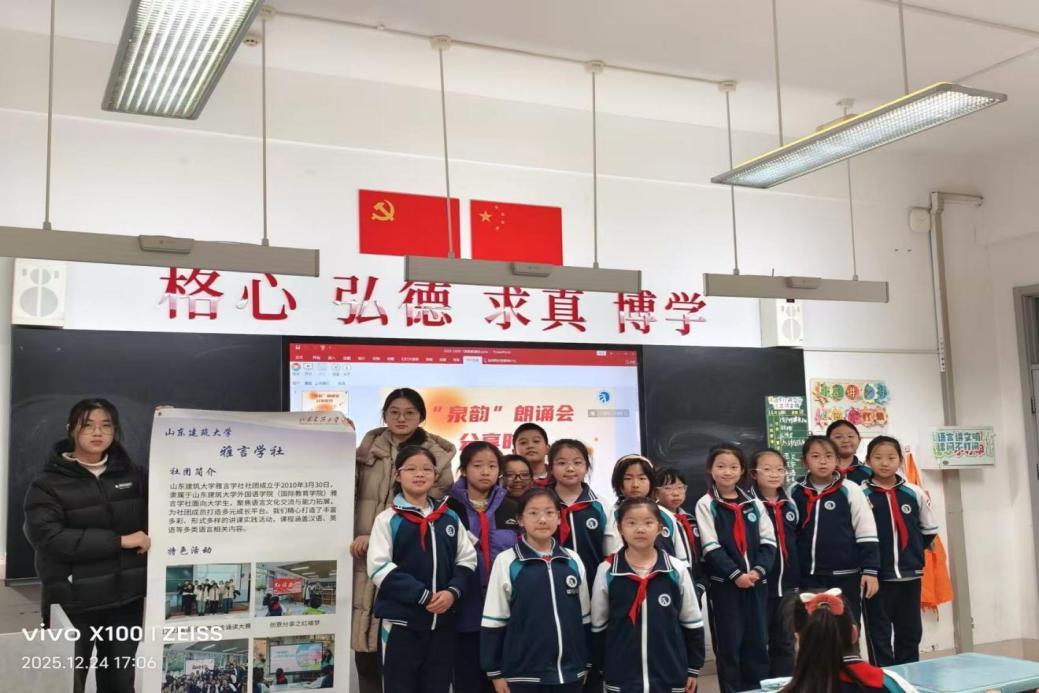 12月24日,雅言学社走进山师二附中,与泉韵文学社联合开展“我爱朗读,闪闪发光”主题朗读展示活动。活动以朗读为桥梁,搭建校际文学交流平台,旨在提升学生的语言表达与舞台展现能力,营造自信表达、热爱文学的校园氛围。