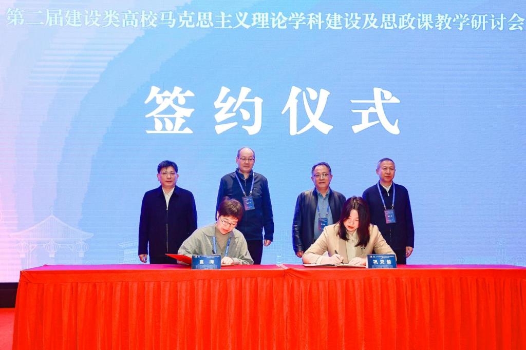 在签约仪式环节,中国建设教育协会培训中心主任袁梅、山东建筑大学马克思主义学院巩克菊教授代表双方签署战略协议。黄志良,中国建设教育协会副理事长兼副秘书长高延伟,吉林建筑大学党委书记李雁冰,杨景波共同见证。