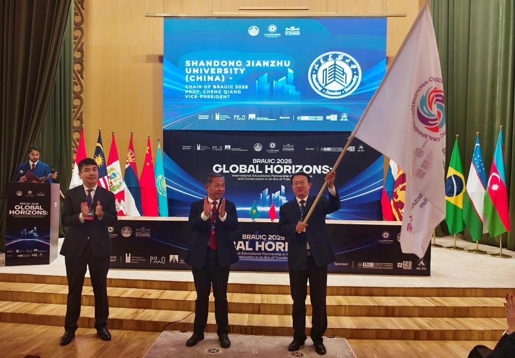 在哈萨克斯坦阿拉木图访问期间,代表团参加了“一带一路”建筑类大学国际联盟2025年会议暨论坛,访问了哈萨克斯坦建筑与土木工程学院。代表团先后参加了联盟预备会、联盟大会暨论坛、专业委员会工作会议、人才培养观摩及技术平台参观。国际联盟与会代表一致同意,山东建筑大学将承办2026年联盟会议。在授旗仪式上,成强向各成员单位发出诚挚邀请,并表示山东建筑大学将充分发挥学科优势,汇聚全球智慧,办好明年会议,推动“一带一路” 建筑类大学深度合作、协同发展。“一带一路”建筑类大学国际联盟下设六个专业委员会,分别聚焦城乡规划与建筑设计、土木工程与智能建造、资源环境与可再生能源、智慧城市与智能交通、机器人与人工智能、文化遗产数字化等领域。我校作为智慧城市与智能交通领域专业委员会牵头单位主持召开平行会议,成强就筹备工作进展与未来发展建议作了专题报告。会议期间,成强还出席见证了鲁班书院乌兹别克斯坦分院揭牌仪式。