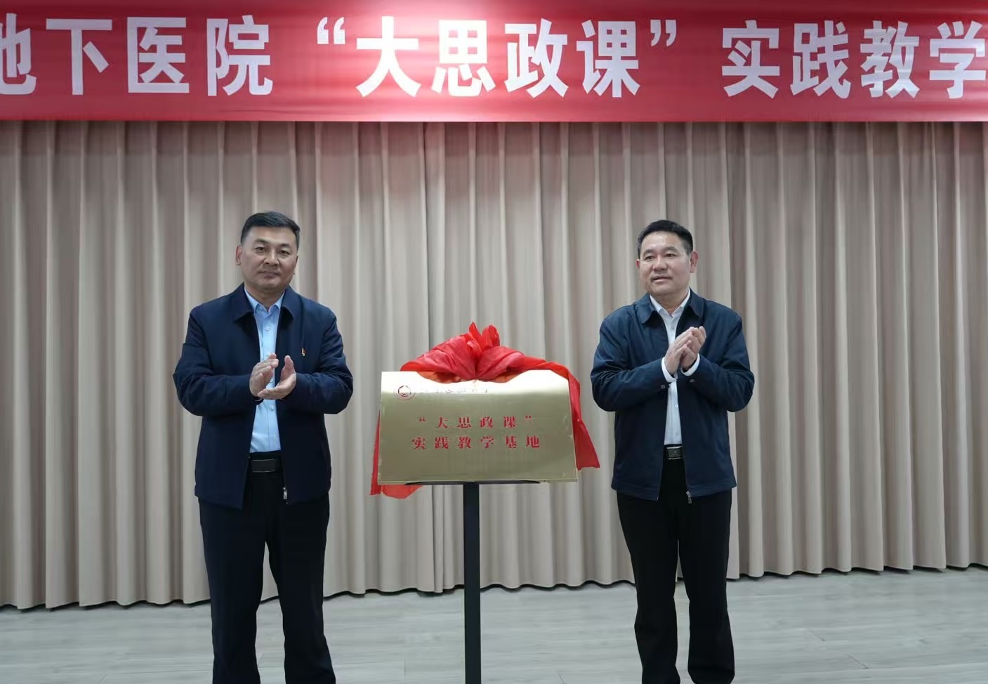 为纪念中国人民抗日战争暨世界反法西斯战争胜利80周年,传承齐鲁大地红色抗战基因,促进思政教育与红色资源双向赋能,深化校地合作,10月30日上午,山东建筑大学在莱州市西海地下医院王门中心医疗区现场教学点举行"大思政课"实践教学基地挂牌仪式。山东建筑大学党委书记杨景波、党委副书记许记中、原纪委书记孙志芳,红色文化宣讲者高凯民,莱州市委常委、组织部部长吴西文出席活动。