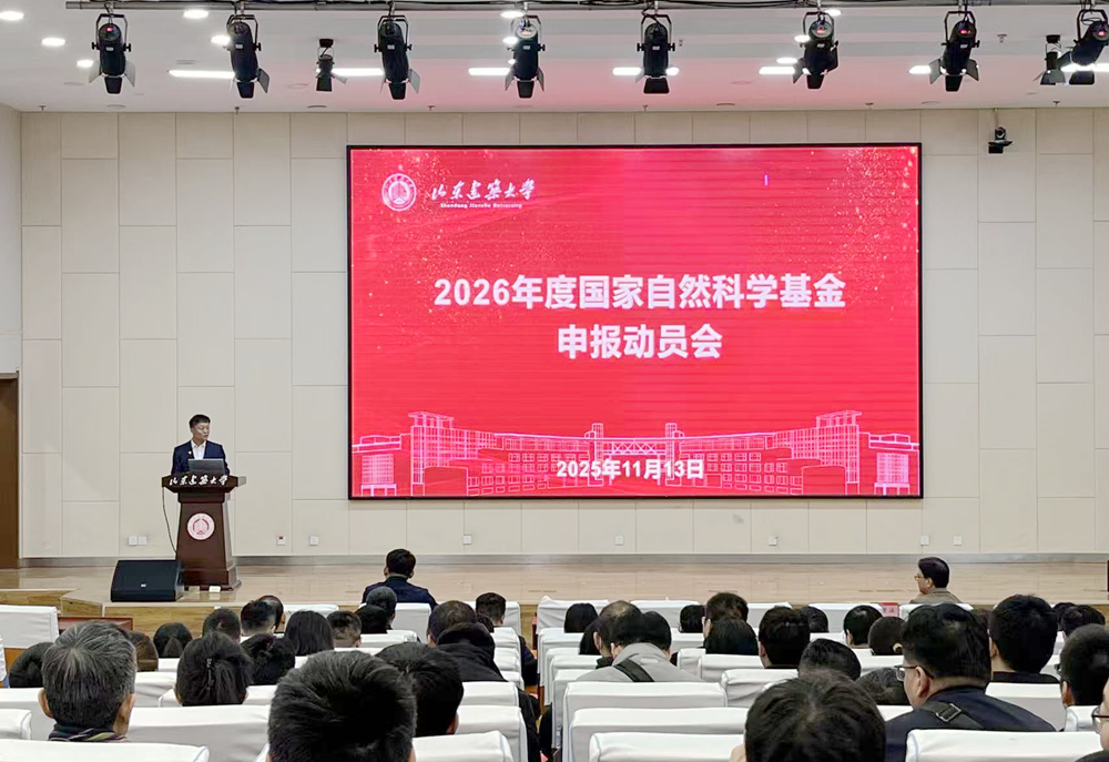 11月13日上午,科学技术处在博学会堂召开2026年国家自然科学基金申报动员大会,北京建筑大学首席教授徐世法作报告。学校党委副书记、校长于德湖出席并讲话,会议由党委委员、副校长邱立平主持。