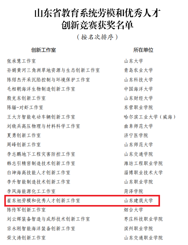 山东建筑大学崔东旭工作室在山东省教育系统劳模和优秀人才创新竞赛获奖