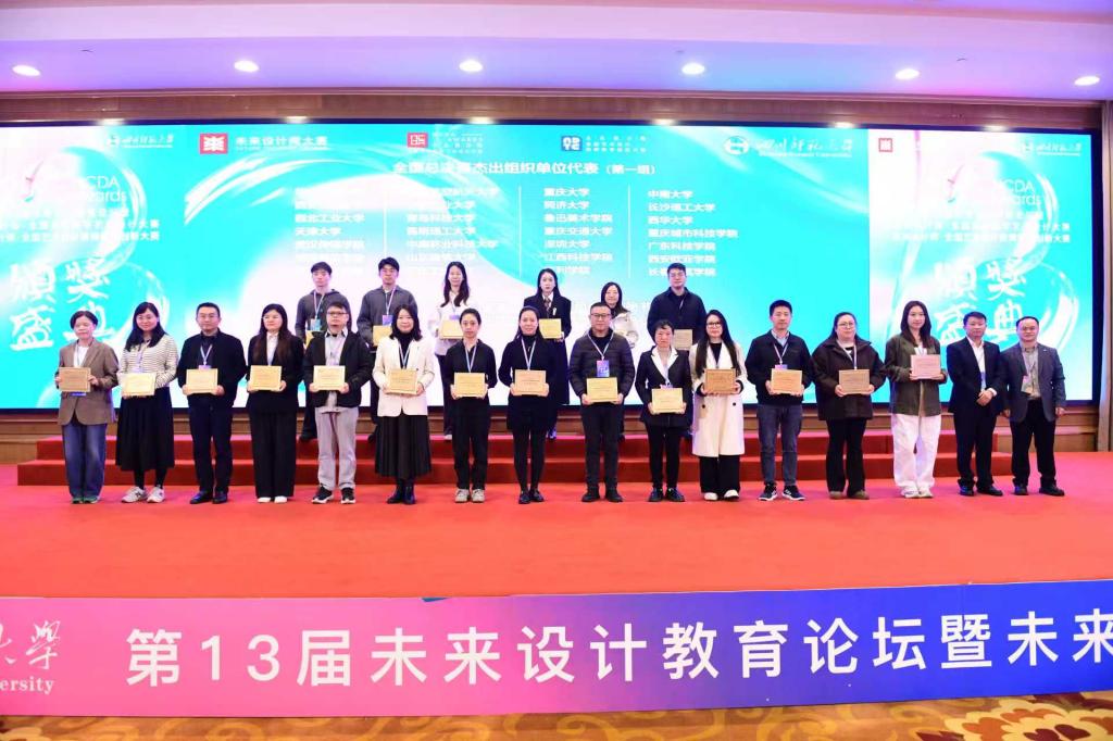 2025年11月23日,第13届未来设计教育论坛暨未来设计师大赛颁奖典礼在成都成功举办。本次活动由未来设计师大赛组委会、四川师范大学、工业和信息化部人才交流中心、民政部智惠乡村志愿服务中心联合举办,四川师范大学美术学院·书法学院承办。学院陈淑飞院长,王志远副院长和大赛国赛一等奖获奖学生纪旭浩出席本次论坛和典礼活动。