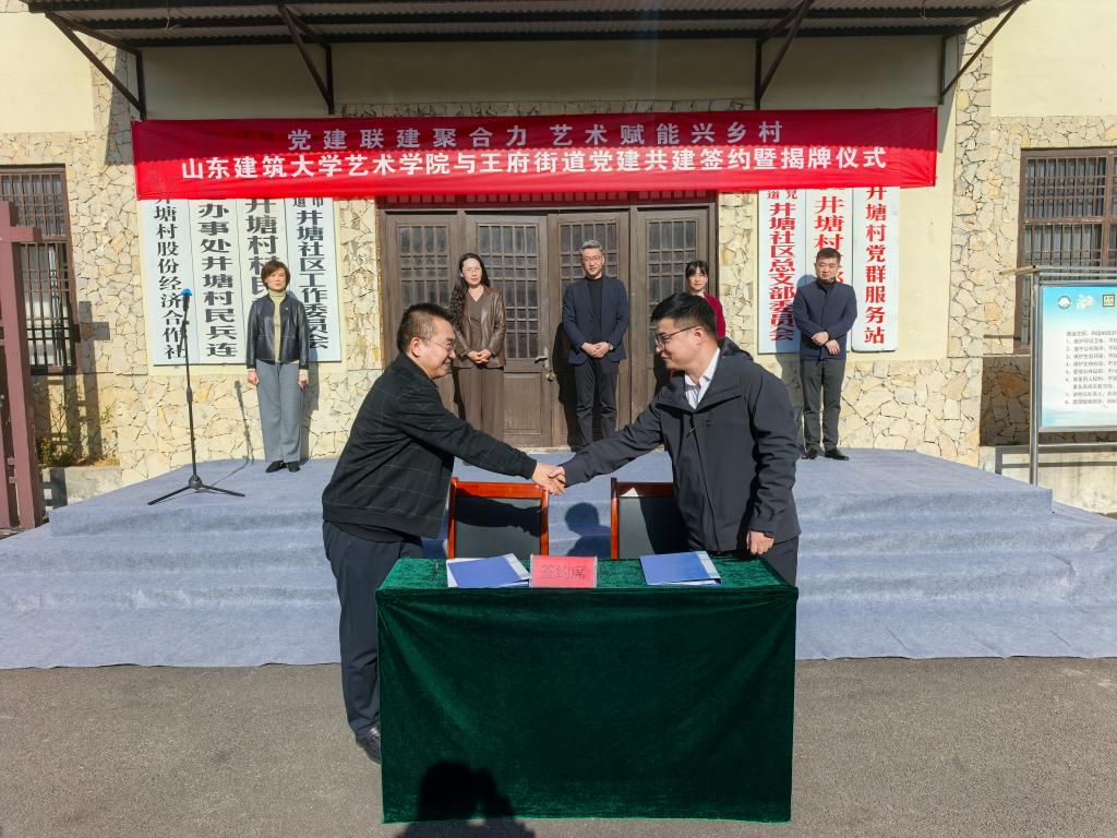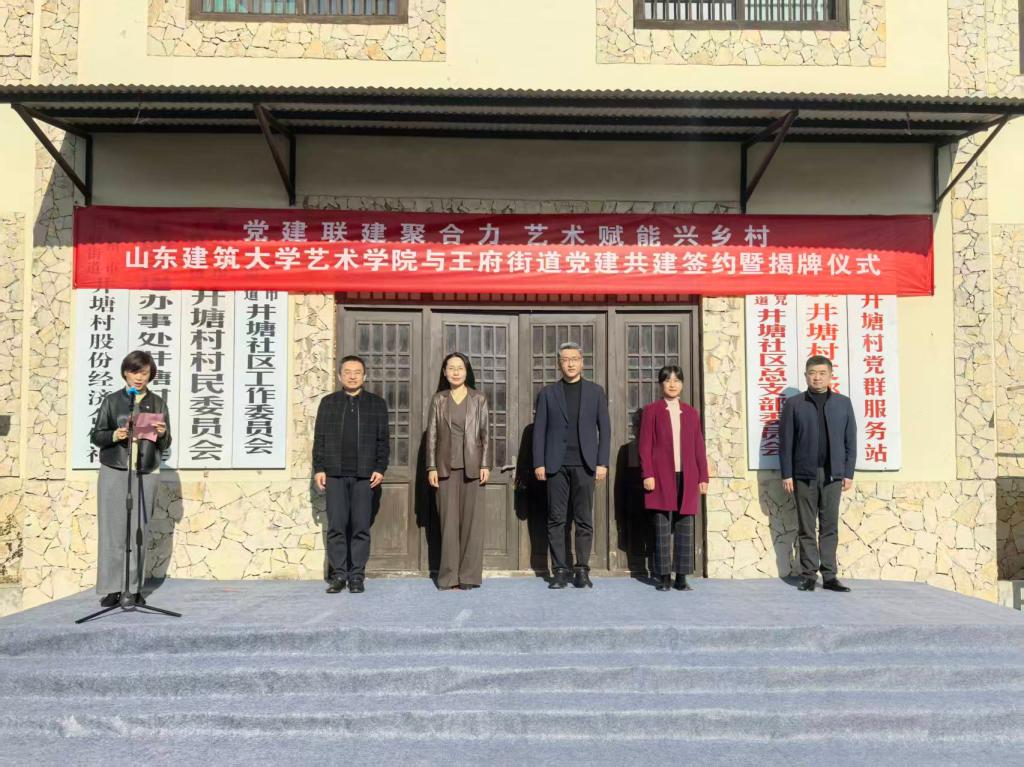 11月26日上午,山东建筑大学艺术学院与青州市文化和旅游局、王府街道办事处在井塘古村文化广场隆重举行党建共建签约暨“王府街道文旅产业发展共同体”揭牌仪式。山东建筑大学艺术学院党委书记盛红梅、院长陈淑飞、副院长王志远以及景观党支部党员代表参加此次共建活动。