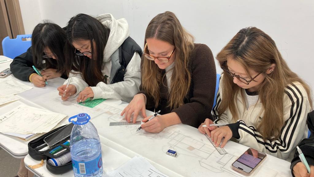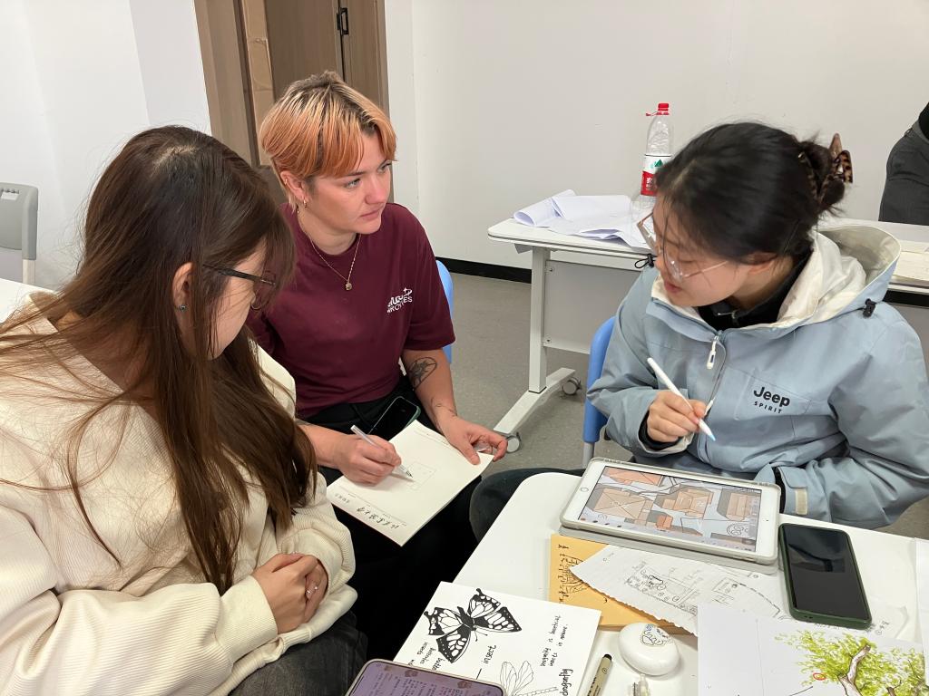 第三、四日是密集的分组作业与创作期。各小组需完成五项核心任务:绘制调查片区的长轴测图、建筑正投影图、摄影调查报告,创建地图术分析,并汇总考察笔记与草图。最终,需将所有成果有机整合,制作成一份设计精良的折叠报告书。在英方教授的悉心指导下,中英学生克服语言障碍,充分发挥各自专业特长,在思维碰撞与协作中不断完善设计方案,其高效的团队合作与高质量的初步成果赢得了英方教授的高度赞赏。